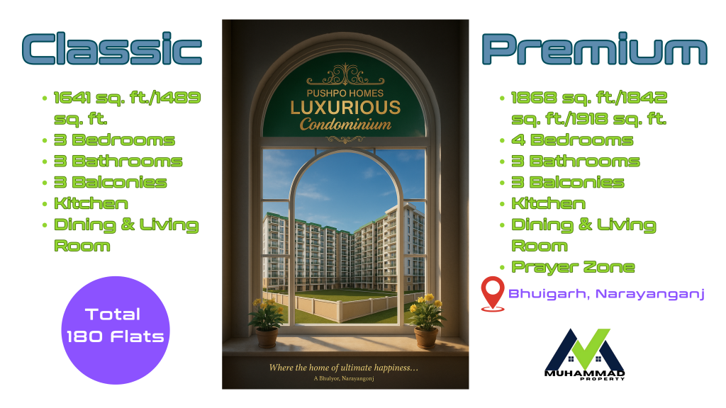 Pushpo Homes Luxurious Condominium (Premium) Pushpo Homes Ltd. presents a modern, luxurious condominium project on 33 katha of prime land in Aftabnagar, Dhaka, located at Block M, Road No. 7, Sector-1 (beside Baroi Tola). Each flat is approximately 1650 sq. ft. and includes: Premium Units: